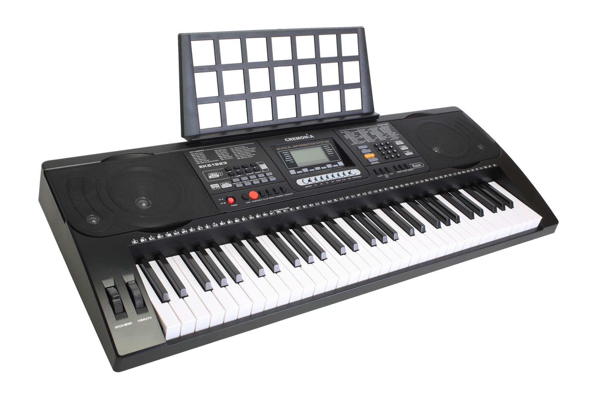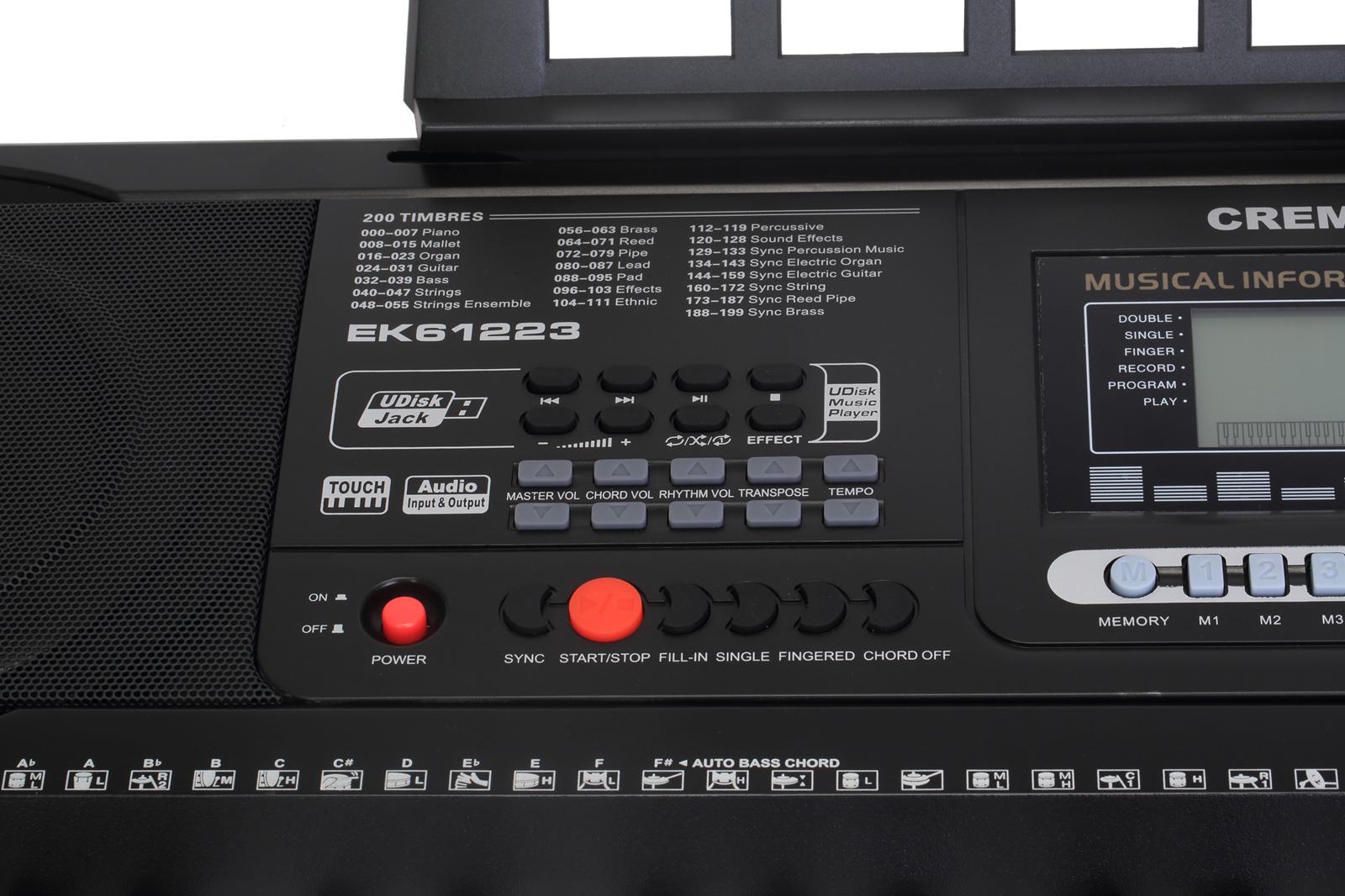 Cremonia EK61223, 61 standart tuşlu (5 oktav) başlangıç seviyesi bir elektronik klavyedir. Enstrüman, temel müzik teorisi ve pratiklerini desteklemek amacıyla dijital ses bankası ve ritim eşlikleri ile donatılmıştır. LCD ekranı üzerinden seçili fonksiyonların takibi yapılabilir. Dahili hoparlör çıkışı ve harici kulaklık bağlantısı ile bireysel çalışma imkanı sunar.