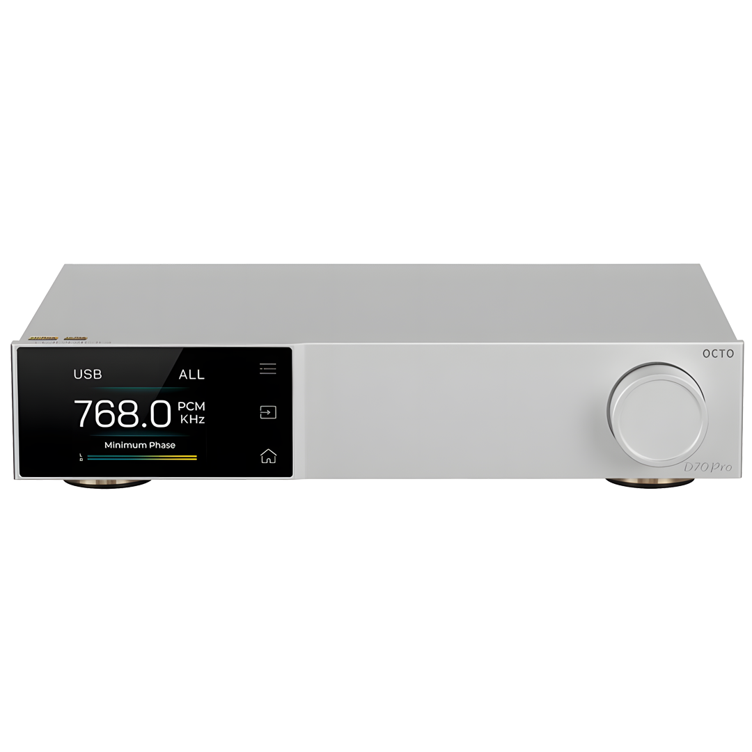 D70 PRO OCTO, 32bit 768kHz'e kadar PCM ses akışlarını ve DSD512'ye kadar DSD'yi desteklemesini sağlayan en az 8 CS43198 DAC yongasına sahiptir.