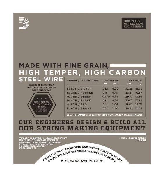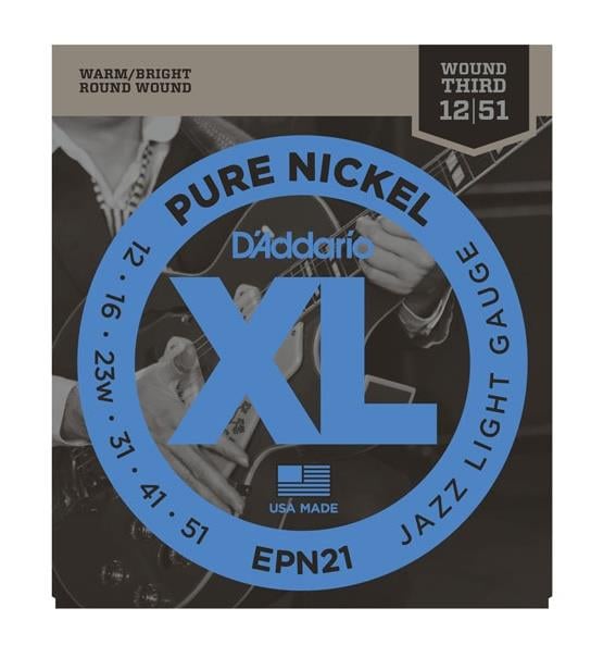 D'Addario EPN21, elektro gitarlar için Pure Nickel (Saf Nikel) sargı teknolojisi ile üretilmiş 12-51 ölçülerinde tel setidir. Saf nikel kullanımı, 1950 ve 60'lı yılların karakteristik sıcak ve vintage tonalitesini modern akort stabilitesiyle birleştirir. Jazz ve Blues icraları için teknik olarak kalibre edilmiştir.