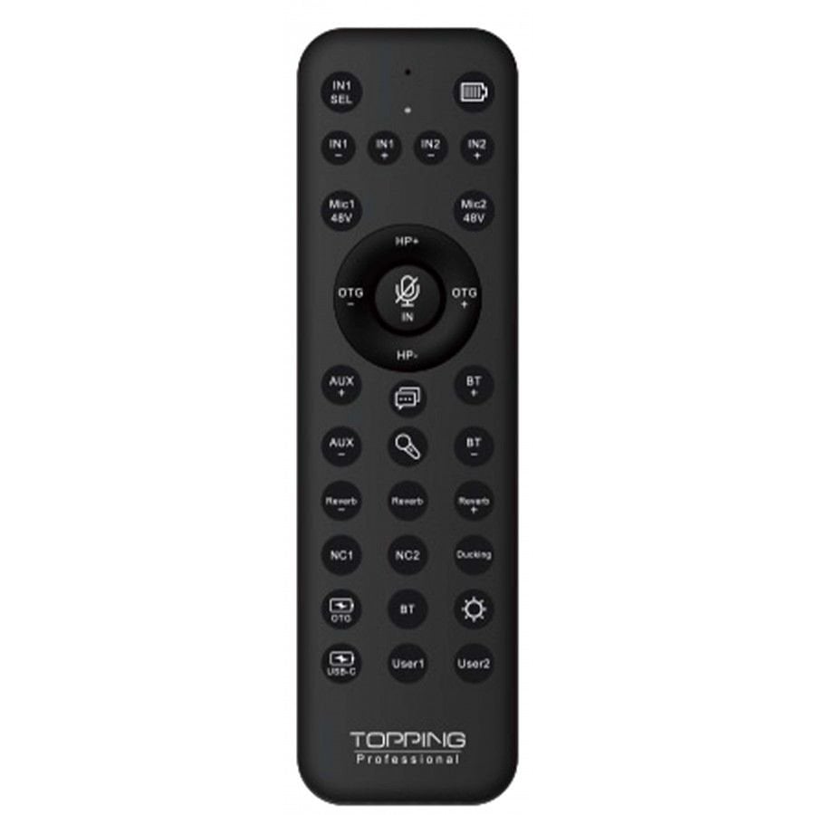 Topping Professional M62: Uzaktan Kumanda • M62 arayüzü, Bluetooth ve IR (kızılötesi) uzaktan kumandasıyla çalışır. Bu kumanda, özellikle canlı yayın ve performans sırasında ses seviyesini ve efektleri hızlı şekilde ayarlamanıza olanak tanır.