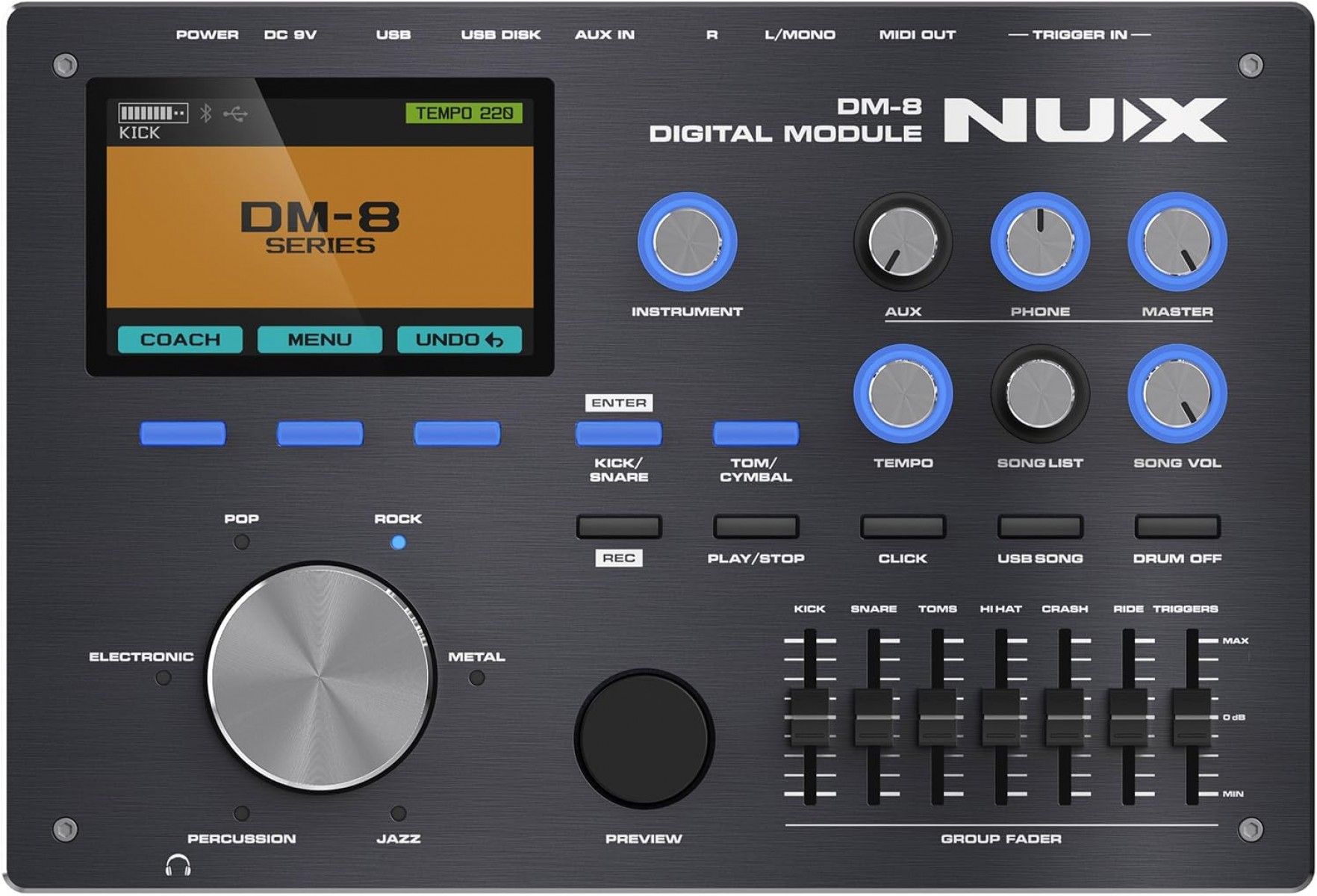 Nux DM-8, markanın en gelişmiş ve profesyonel modelidir. 12 inçlik büyük trampeti, bağımsız sensörü sayesinde hayalet notaları (ghost notes) ve kenar vuruşlarını akustik hassasiyetinde algılar. 10 inçlik Kick pedi, çift pedal kullanımına uygun, stabil ve gerçekçidir.