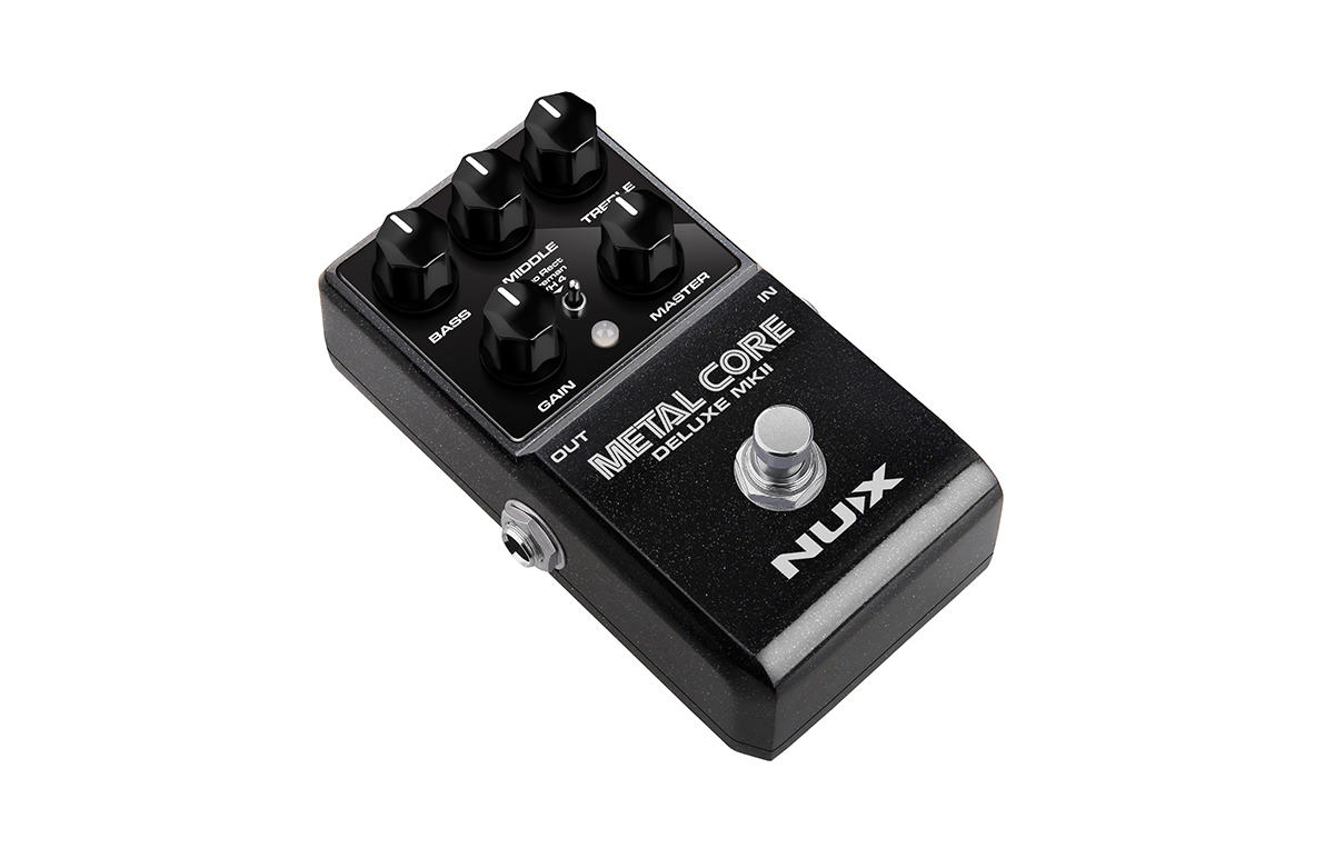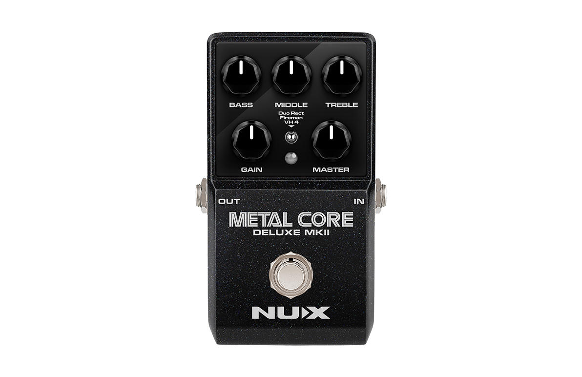 NUX METAL CORE DELUXE MKII, Duo Rect, Fireman ve VH 4 dahil olmak üzere 3 farklı yüksek gain li amfi modeline sahip, yüksek gain li bir preamp pedalıdır.