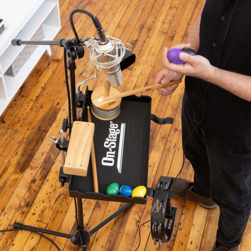 Platform üzerindeki köpük kaplama, enstrümanların yerinde kalmasını sağlar ve performans sırasında shaker ve diğer enstrümanların sessiz bir şekilde yerleştirilmesine olanak tanır.