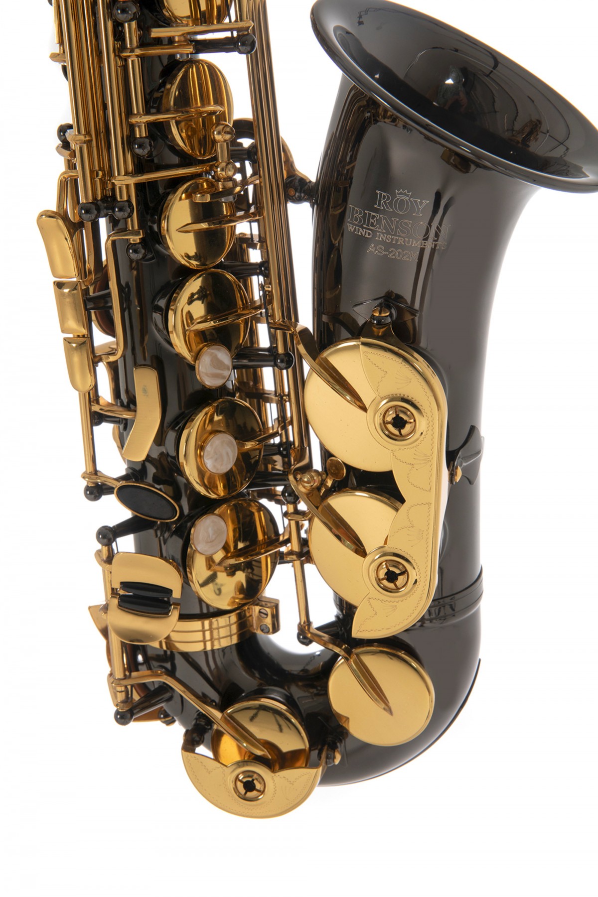Roy Benson AS-202K Alto Saksafon, özel antrasit lake gövde, pirinç cilalı tuşlar ve sertleştirilmiş çelik yaylara sahiptir.