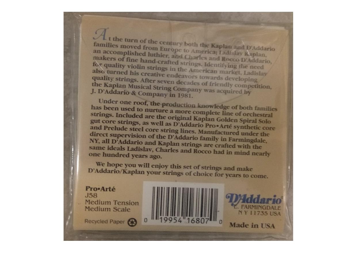 D'Addario J58, 15-16 inç arası gövde boyuna sahip viyolalar (Medium Scale) için üretilmiş sentetik özlü tel takımıdır. Pro-Arte teknolojisi, enstrümana koyu ve lirik bir ses karakteri kazandırırken nem değişimlerine karşı üst düzey tolerans gösterir. Akademik icralar için teknik olarak kalibre edilmiş gerilim değerlerine sahiptir.